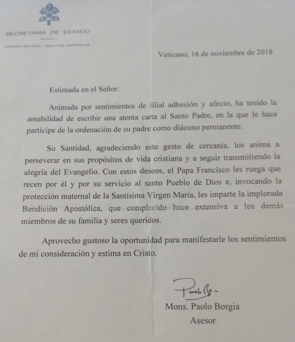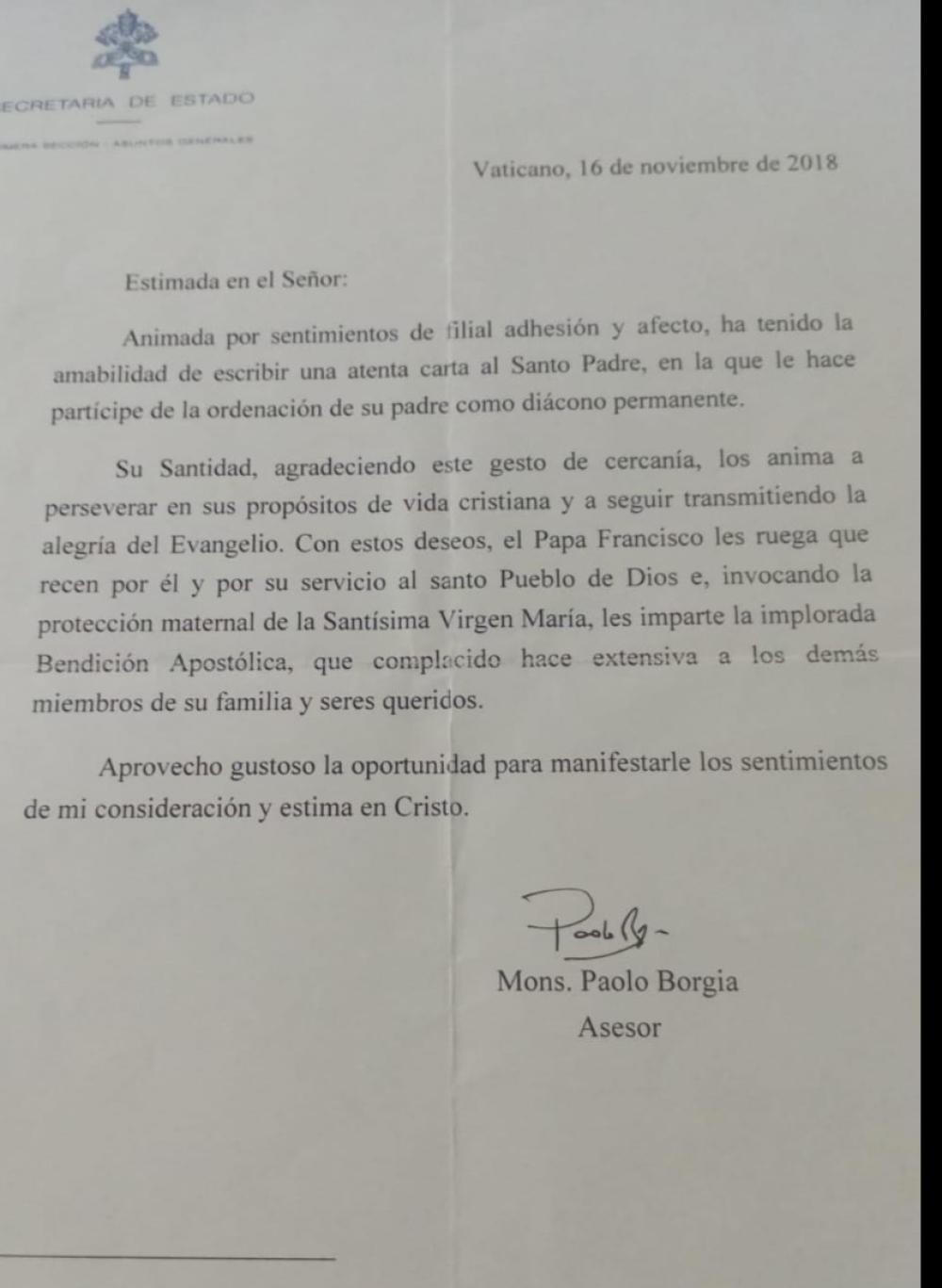 Casi a fines de ese año llegó un correo desde El Vaticano que decía: "Vaticano, 16 de noviembre de 2018. Estimada en el Señor: Animada por sentimientos de filial adhesión y afecto, ha tenido la amabilidad de escribir una atenta carta al Santo Padre, en la que le hace partícipe de la ordenación de su padre como diácono permanente. Su Santidad, agradeciendo este gesto de cercanía, los anima a perseverar en sus propósitos de vida cristiana y a seguir transmitiendo la alegría del Evangelio. Con estos deseos, el Papa Francisco les ruega que recen por él y por su servicio al santo Pueblo de Dios e, invocando la protección maternal de la Santísima Virgen María, les imparte la implorada Bendición Apostólica, que complacido hace extensiva a los demás miembros de su familia y seres queridos. Aprovecho gustoso la oportunidad para manifestarle los sentimientos de mi consideración y estima en Cristo. Mons. Paolo Borgia. Asesor
