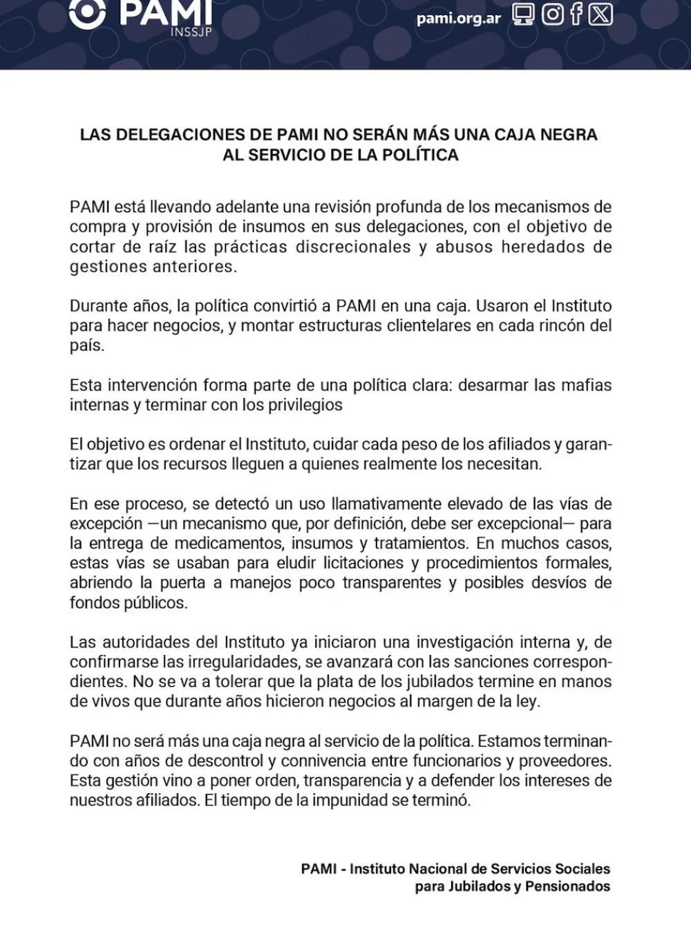 "Durante años, la política convirtió a PAMI en un instrumento para hacer negocios y establecer estructuras clientelistas", señalaron desde el organismo. En este contexto, se anunció una reforma integral para desarticular privilegios y avanzar en sanciones si se confirman las irregularidades.