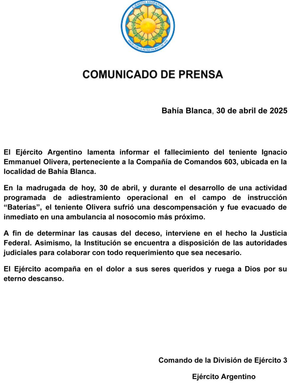 El Ejército Argentino lamenta informar el fallecimiento del teniente Ignacio Emmanuel Olivera, perteneciente a la Compañía de Comandos 603, ubicada en la localidad de Bahía Blanca.