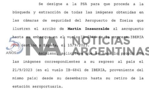El pedido lo formuló para que la PSA indague en las cámaras y determine si se lo ve a Insaurralde el 15 de septiembre pasado en Ezeiza, oportunidad en que abordó el vuelo IB-6844 de la empresa Iberia con destino a España. Su regreso fue el 21 de septiembre, según informó el sitio Noticias Argentinas.