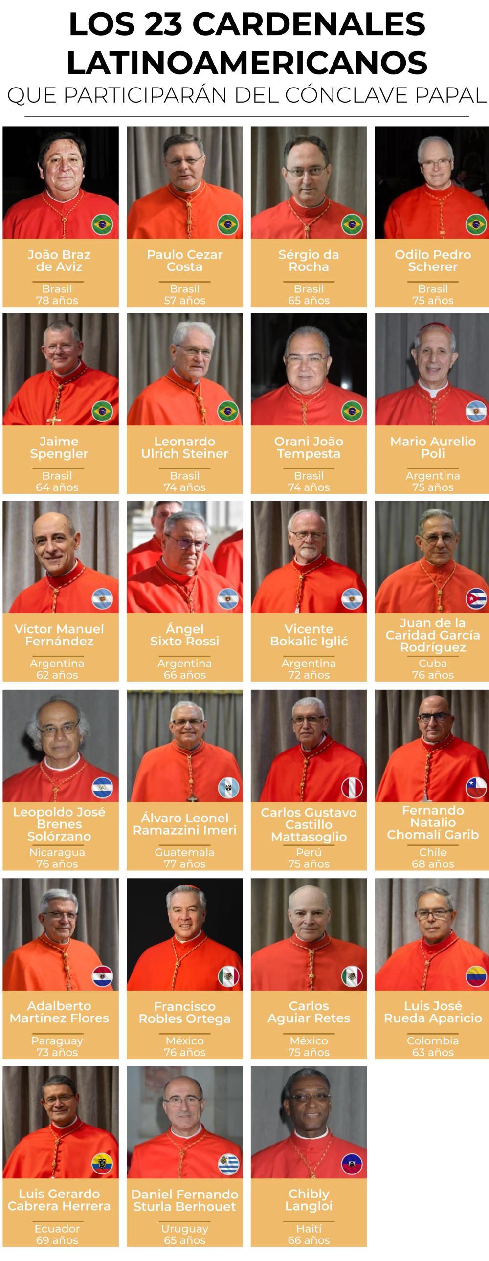 El cónclave para elegir al sucesor del papa Francisco comenzará el miércoles a las 16:30 (hora local) con la entrada de los 133 cardenales electores a la Capilla Sixtina. De ellos, 23 son latinoamericanos, incluyendo representantes de Brasil (7), Argentina (4), México (2) y otros países con uno cada uno.