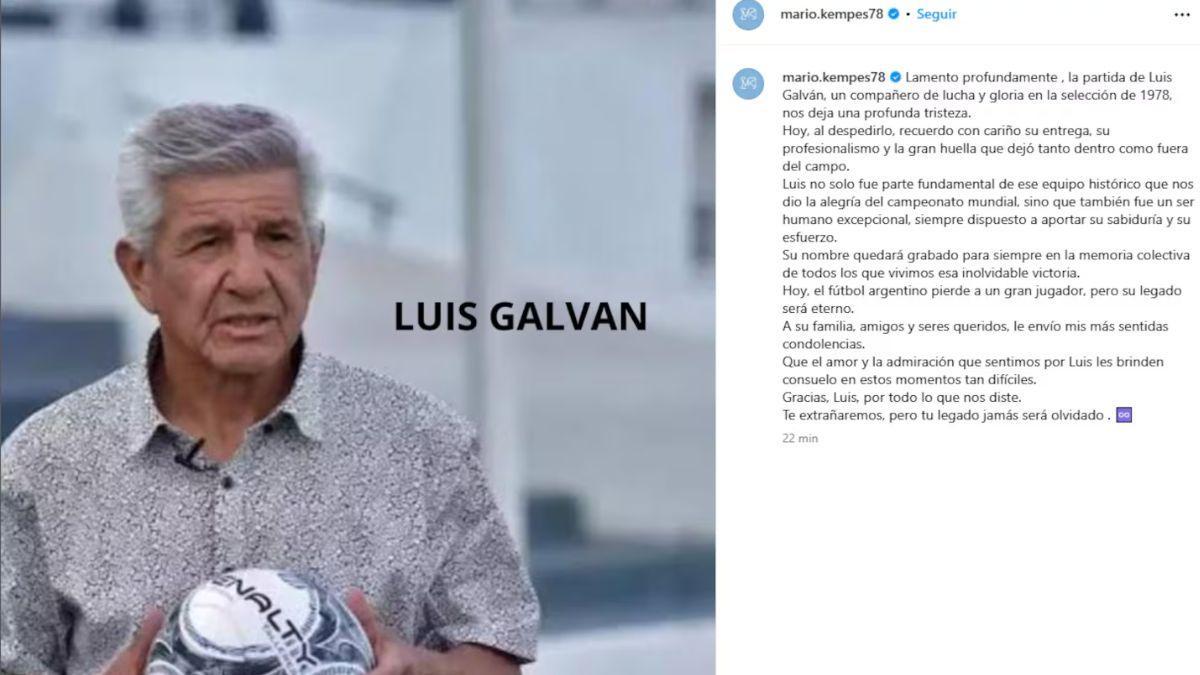 "Lamento profundamente la partida de Luis Galván, un compañero de lucha y gloria en la Selección de 1978, nos deja una profunda tristeza", escribió "El Matador" en su cuenta de Instagram.