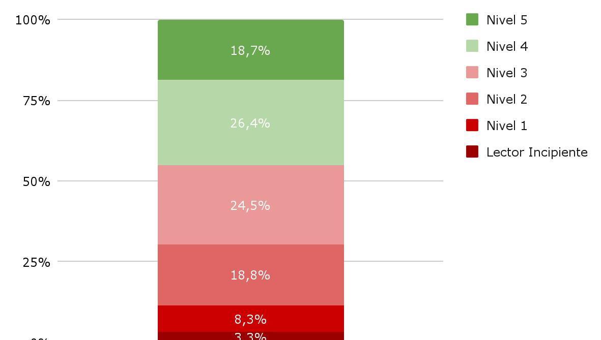 En las pruebas Aprender 2024, el 3,3% de los alumnos se ubicaron en el nivel "lector incipiente"; 8,3% en el nivel 1; 18,8% en el nivel 2; 24,5% en el nivel 3; 26,4% en el nivel 4 y 18,7% en el nivel 5. El nivel "lector incipiente" se refiere a estudiantes que leen palabras con apoyo de imágenes y se están iniciando en la lectura de enunciados breves, mientras que el nivel 1 corresponde a estudiantes que se están iniciando en la lectura de textos simples. En el otro extremo, en el nivel 4 se ubican los estudiantes que comprenden textos complejos de forma literal, inferencial y reflexiva; y en el nivel 5 quienes comprenden textos complejos de forma literal, inferencial y reflexiva, y establecen inferencias complejas.