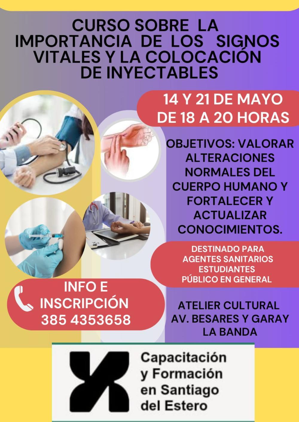 Con el auspicio del Atelier Cultural de la ciudad de La Banda, se realizará el curso sobre "La importancia de los signos vitales y la colocación de inyectables", que se dictará los días 14 y 21 de mayo, en el local del Atelier (Av. Besares y Garay).
