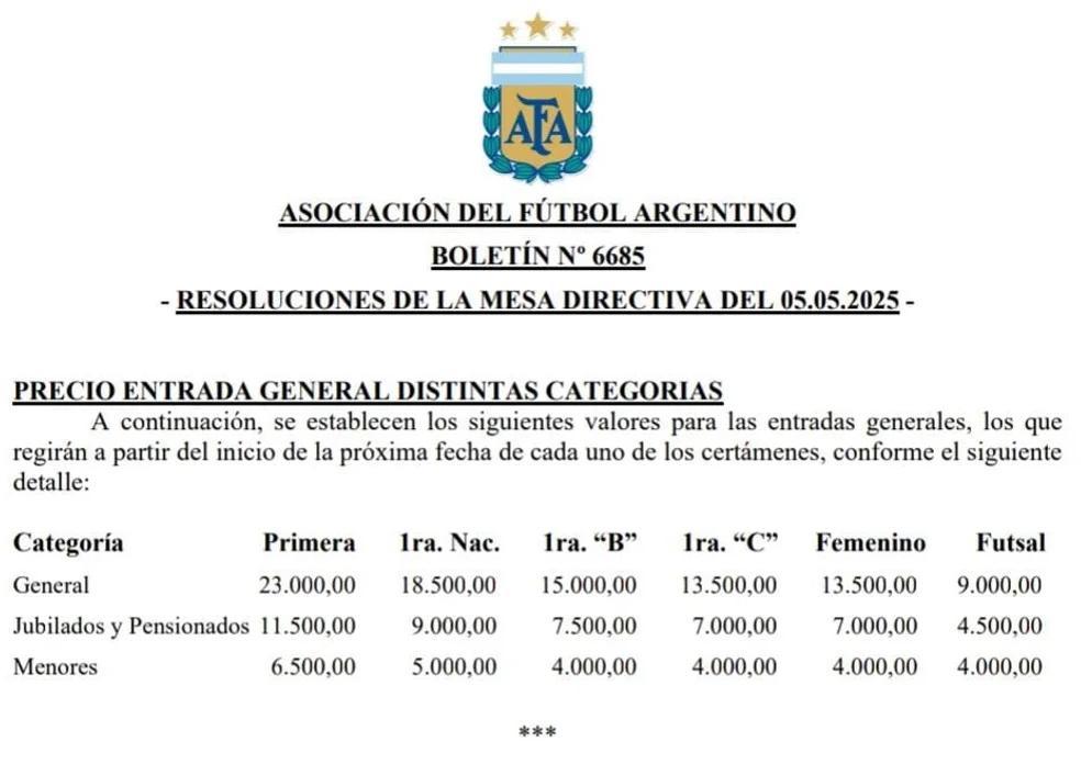 La Asociación del Fútbol Argentino (AFA) a través del boletín oficial Nº 6685, anunció los nuevos precios de las entradas para las distintas categorías del fútbol argentino, que entrarán en vigor este fin de semana. Los aumentos impactan en competiciones como la Primera Nacional, la Primera B Metropolitana, la Primera C, el Fútbol Femenino y el Futsal.