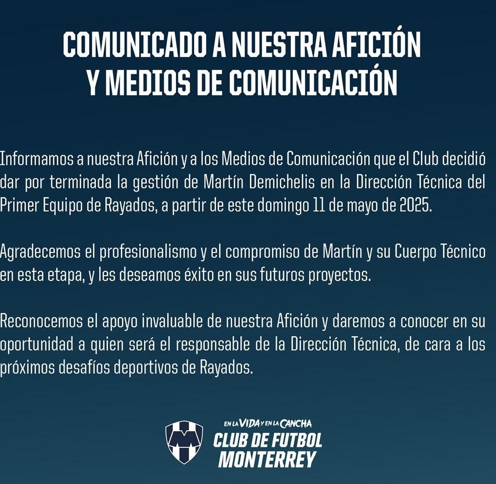 A través de un comunicado en sus redes sociales, el club informó: "Informamos a nuestra afición y a los medios de comunicación que el club ha decidido dar por terminada la gestión de Martín Demichelis como director técnico del primer equipo de Rayados, a partir de este domingo 11 de mayo de 2025".