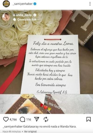 La conductora publicó una imagen en la que mostraba flores blancas, sus favoritas, acompañadas de una carta que, según ella, también provenía del Galatasaray. "Muero de amor. Rosas blancas, mis favoritas", escribió. No obstante, a diferencia de la publicación de la China, Wanda no etiquetó al club, y algunos detalles despertaron dudas entre los usuarios.