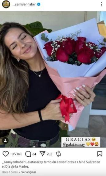 La actriz, visiblemente emocionada, compartió el presente en sus redes sociales, agradeciendo al club y mostrando con alegría el ramo y la dedicatoria. La historia fue acompañada por una simple palabra: "Gracias", junto a la mención al equipo turco, donde juega su actual pareja.