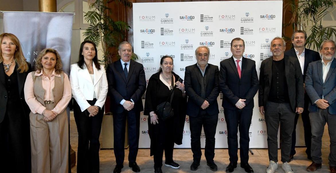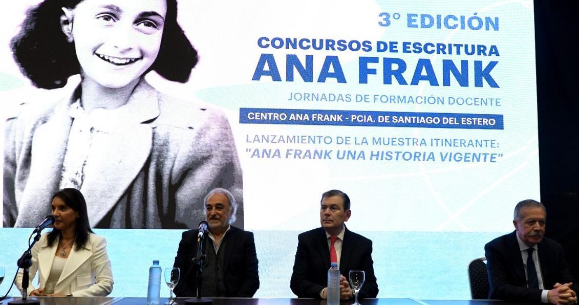 El gobernador Gerardo Zamora, junto con el director del Centro Ana Frank Argentina para América Latina, Héctor Shalom; el jefe de Gabinete, Elías Suárez, y la ministra de Educación, Mariela Nassif, realizó en el Centro de Convenciones Fórum el lanzamiento de la tercera edición de los Concursos de Escritura "De Ana Frank a nuestros días" y la apertura de la Jornada de Capacitación para Docentes.
