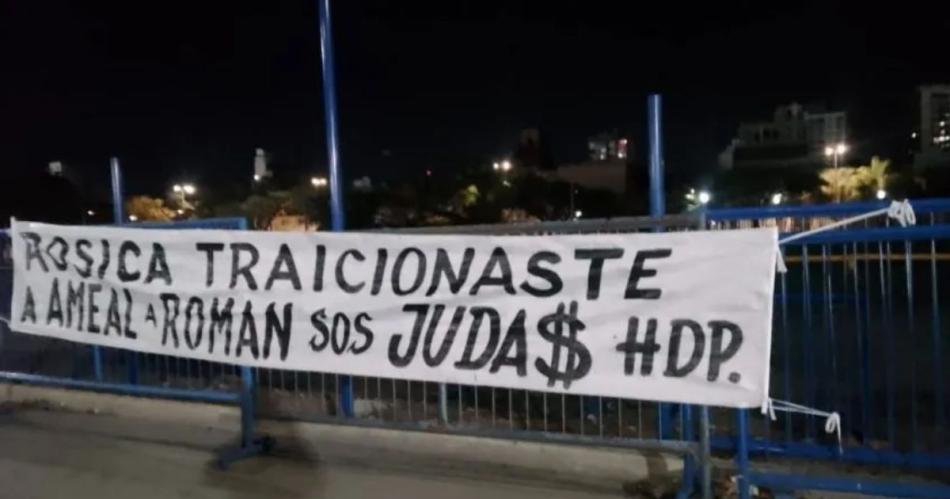 "Rosica traicionaste a Ameal y a Román, sos JUDA$", fue el mensaje de uno de los pasacalles. En el segundo, se apuntó al mismo directivo y también a Algieri: "Devuelvan los 45 palos de los hierros".