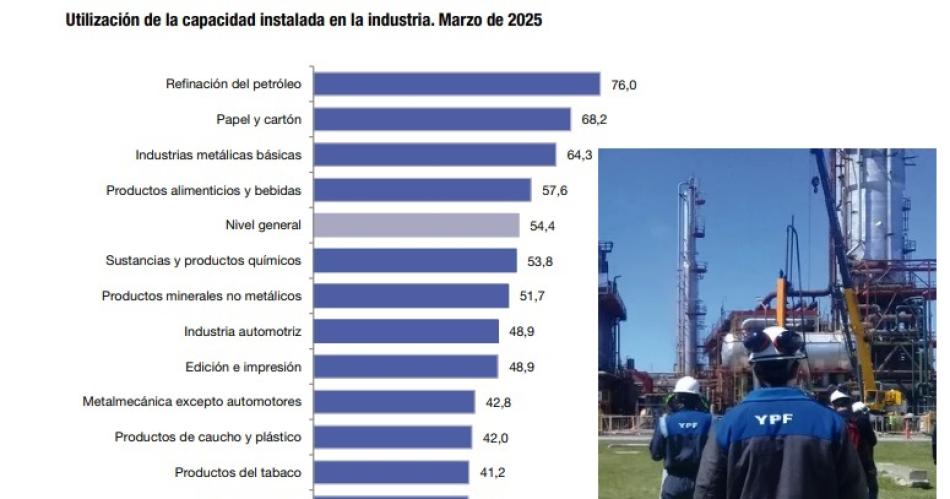 En marzo de 2025, la utilización de la capacidad instalada en la industria, se ubicó en el 54,4%, según un informe publicado por el Indec, lo que representa un punto por encima del 53,4% de igual mes del año 2024 y una caída de casi 14 puntos interanuales, comparado contra marzo de 2023 cuando ese nivel se ubicaba en el 67,3%.