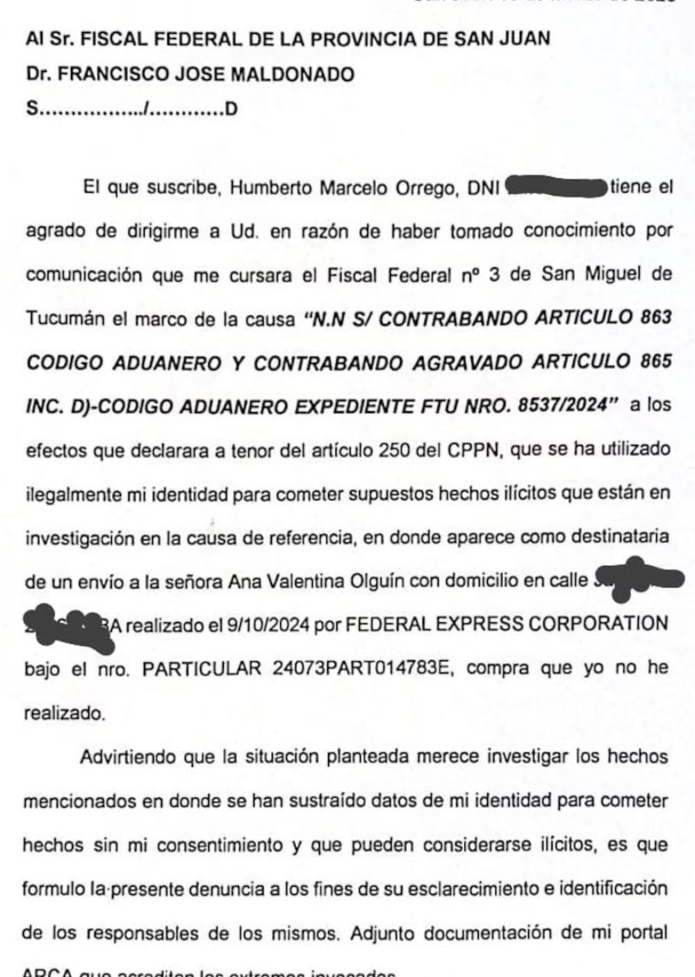 La denuncia fue presentada por Orrego ante la justicia sanjuanina el pasado 10 de marzo, luego de detectar que su identidad fue empleada sin autorización para concretar una compra internacional en octubre de 2024. El pedido fue despachado a un domicilio en la Ciudad Autónoma de Buenos Aires vinculado a Olguín, mediante la empresa FedEx.
