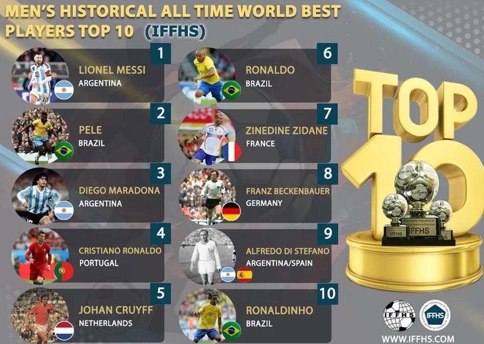La Federación Internacional de Historia y Estadística del Fútbol (IFFHS) publicó su lista de los diez mejores futbolistas de todos los tiempos y generó fuerte repercusión en redes sociales. Lionel Messi encabeza el ranking, superando a leyendas como Pelé y Diego Maradona, mientras que Cristiano Ronaldo quedó fuera del podio.