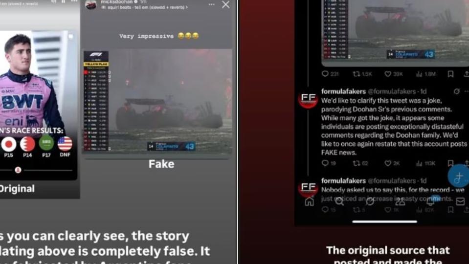 Según explicó en un posteo en su cuenta de Instagram, se difundió un contenido editado en el que supuestamente su padre se burlaba del accidente que sufrió Franco Colapinto durante la clasificación en Ímola.