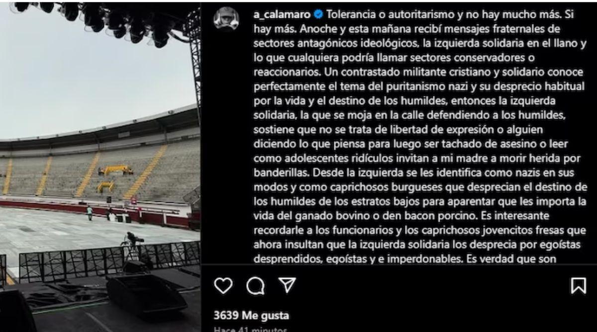 "Tolerancia o autoritarismo, y no hay mucho más. O sí. Anoche y esta mañana recibí mensajes fraternales de sectores ideológicamente antagónicos. La izquierda solidaria que se moja en la calle defendiendo a los humildes, y también sectores conservadores. Ambos, desde lugares distintos, comprenden que no se trata solo de corridas o animales, sino del desprecio por el destino de los más humildes. La violencia verbal que recibí, que incluso invita a que mi madre muera herida por banderillas, no es libertad de expresión. Es otra cosa. Es odio", señaló el músico, en el inicio de su extenso mensaje, acompañado por una imagen del recinto donde se realizó el evento.