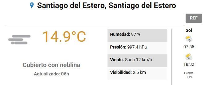 Santiago del Estero amaneció este jueves 22 de mayo con una densa neblina y cielo cubierto, según informó el Servicio Meteorológico Nacional (SMN) a través de su sitio web. En este sentido, dada la poca visibilidad (2.5 km), recomienda circular con extrema precaución.
