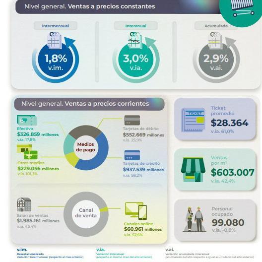 En las ventas totales a precios corrientes, durante marzo de 2025, los grupos de artículos con los aumentos más significativos, según su variación interanual, fueron: "Indumentaria, calzado y textiles para el hogar", con 116,2%; "Electrónicos y artículos para el hogar", con 84,9%; "Alimentos preparados y rotisería", con 76,7%; y "Carnes", con 70,7%.