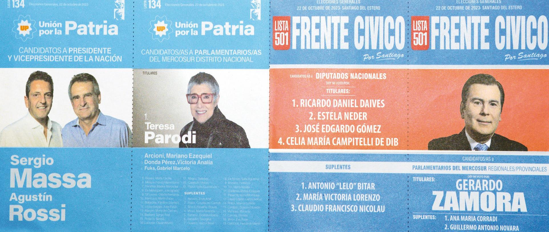 Serán tres largas, con cuatro categorías: presidente y vicepresidente; parlamentarios del Mercosur distrito único, diputados nacionales y parlamentario del Mercosur distrito Santiago del Estero. Las otras tres boletas serán cortas debido a que sólo presentarán candidatos a presidente y vicepresidente, y a parlamentarios del Mercosur distrito único.