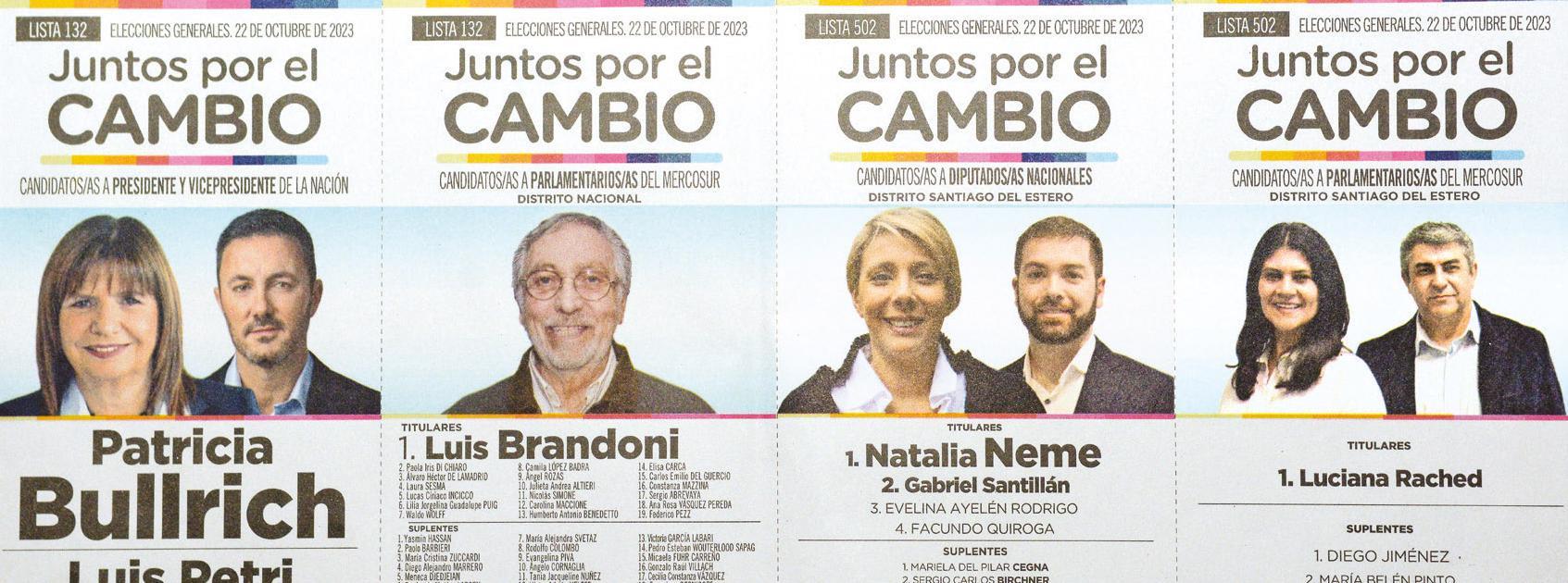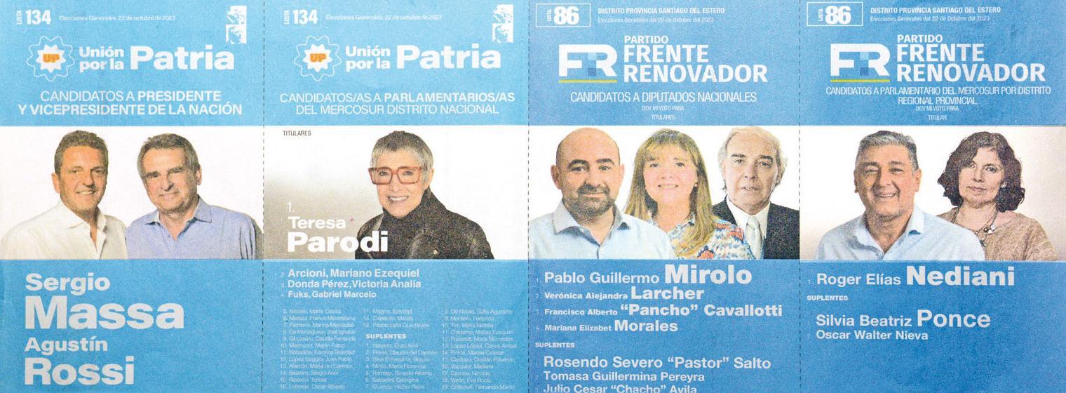 La cuenta final de las boletas que se hallarán en el cuarto oscuro dan seis, porque las listas del Frente Cívico y del Frente Renovador adhieren a la fórmula de Unión por la Patria; la Juntos por el Cambio que lleva boleta completa; y las boletas cortas de La Libertad Avanza, Hacemos por Nuestro País y FIT-Unidad.