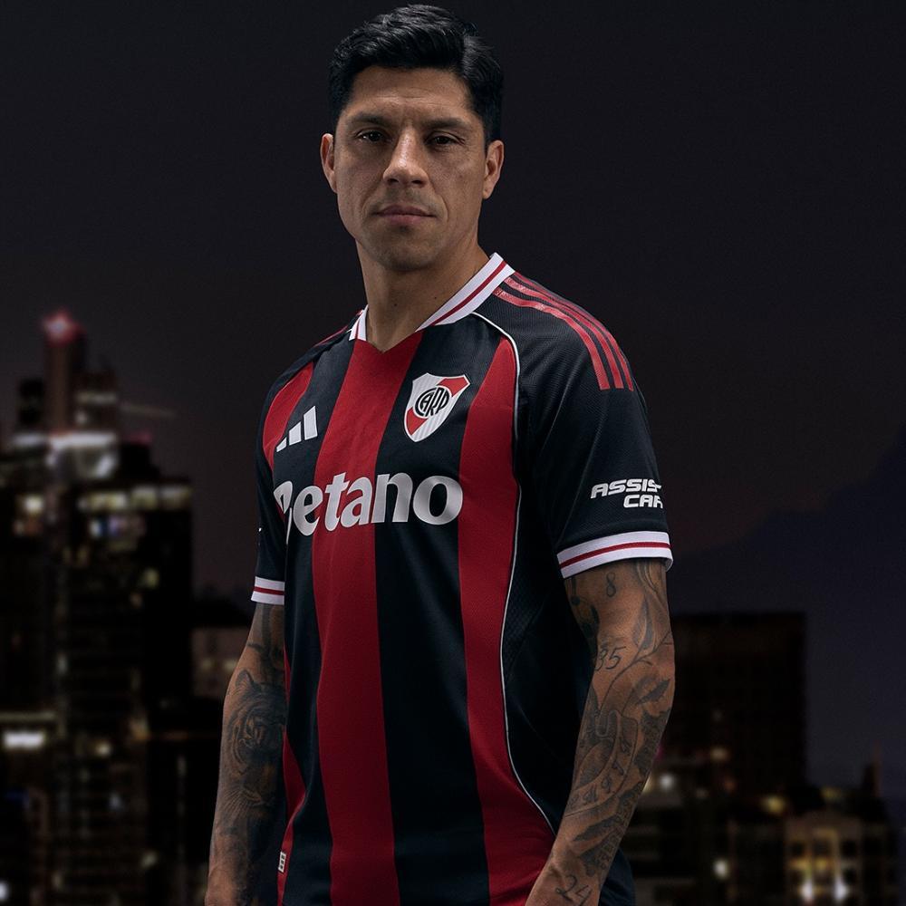 En tanto, la camiseta titular de River rememora la indumentaria que utilizó en el Mundial de Clubes 2015, con las tres franjas horizontales rojas casi al final de la manga. La camiseta suplente, negra con bastones rojos verticales, conlleva consigo una historia que rememora al globo aerostático que posó en el estadio Monumental en la celebración del Metropolitano 1975.