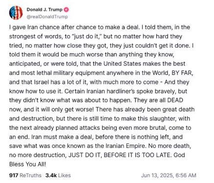 Según el expresidente, "ya ha habido una gran muerte y destrucción, pero todavía hay tiempo para hacer que esta masacre, con los próximos ataques ya planeados siendo aún más brutales, llegue a su fin". Concluyó su mensaje con una fuerte exhortación: "Irán debe llegar a un acuerdo, antes de que no quede nada, y salvar lo que una vez fue conocido como el Imperio Iraní. No más muerte, no más destrucción, SÓLO HÁGANLO, ANTES DE QUE SEA DEMASIADO TARDE".