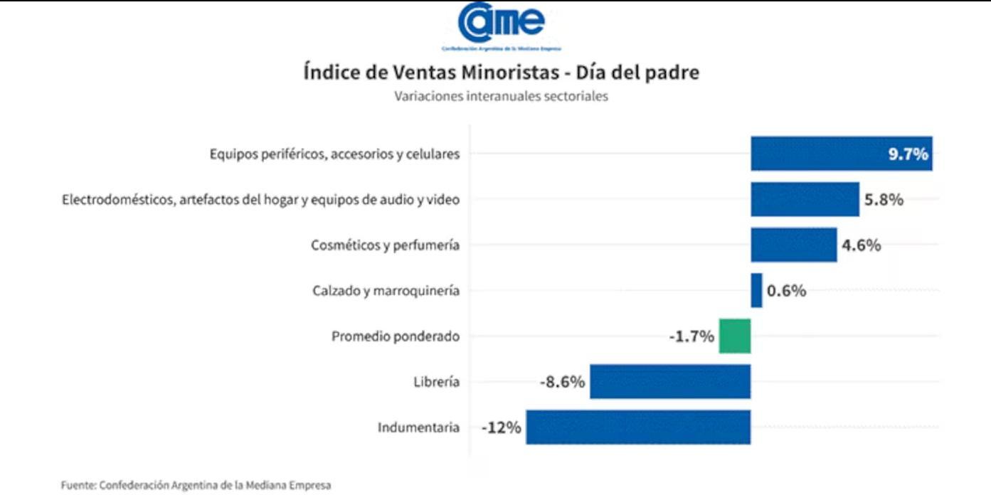 Las ventas por el Día del Padre 2025 cayeron 1,7% este año frente a 2024, pese a que más del 90% de los comercios realizaron promociones especiales, según un informe de la Cámara Argentina de la Mediana Empresa (CAME).
