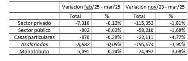 Los datos oficiales muestran una contracción que afecta tanto al sector privado como al público y al empleo en casas particulares. Solo en el sector privado se destruyeron 115.353 empleos, al pasar de 6.369.119 trabajadores registrados en noviembre a 6.253.766 en marzo. En el caso del empleo público, el número descendió de 3.466.731 a 3.408.521, lo que representa 58.210 puestos menos. El trabajo doméstico también sufrió un retroceso, con una caída de 22.111 empleos, pasando de 463.640 a 441.529 trabajadores registrados.