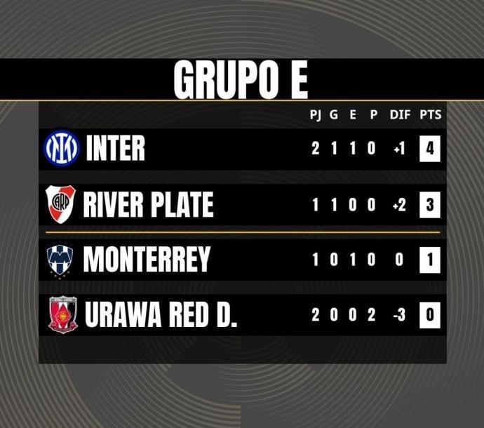 La tercera y última fecha del grupo se disputará el miércoles 25 de junio a las 22 (hora argentina), con los duelos Inter vs. River y Monterrey vs. Urawa Red Diamonds.