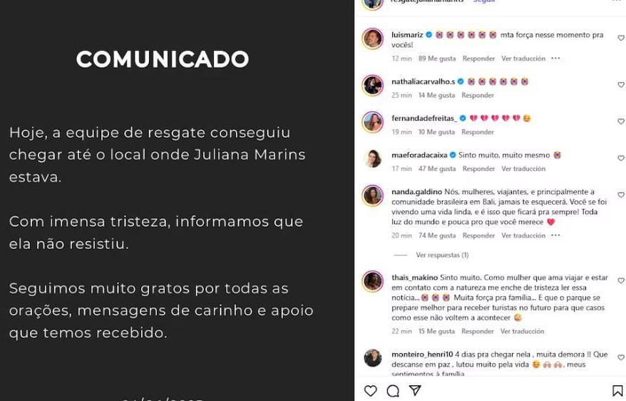 La noticia fue confirmada por su familia a través de la cuenta de Instagram @resgatejulianamarins, creada para seguir el caso: "Hoy un equipo de rescate logró llegar al lugar donde estaba Juliana. Con mucha tristeza informamos que no resistió", escribieron. "Seguimos muy agradecidos por todas las oraciones, mensajes de afecto y apoyo que hemos recibido", añadieron en la publicación.