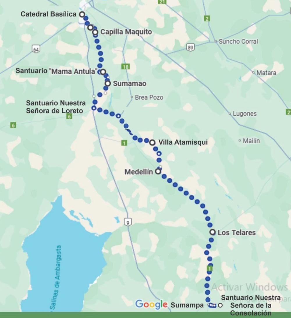 Luego, pasando por Villa Vieja hasta el camino La Dormida- Tío Pozo; en Villa Atamisqui, parroquia Inmaculada Concepción (allí se pernoctará). El domingo seguirá por Medellín, Chilca Juliana, Los Telares, Ramírez de Velazco y se llegará al Santuario de Sumampa.