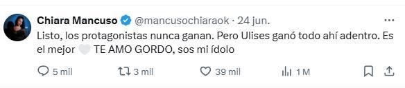 Luego de que supiera que Tato consiguió el premio mayor, Chiara arrojó un comentario enfurecida. "Listo, los protagonistas nunca ganan. Pero Ulises ganó todo ahí adentro. Es el mejor. TE AMO GORDO, sos mi ídolo", escribió en X.