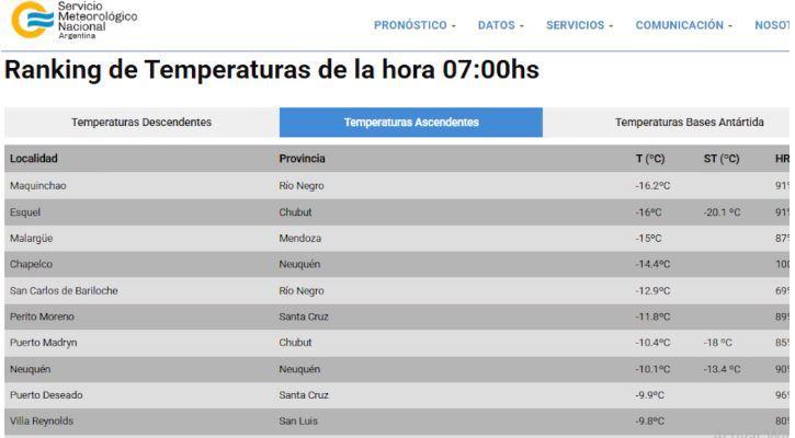 Hoy, la ciudad más fría fue Esquel (Chubut), que amaneció con -17,2°C, aunque en algunos sectores de Río Negro se registraron mínimas por debajo de los -20°C. En tanto, en Neuquén, el termómetro marcó -10,8°C y también es una de las ciudades más frías.
