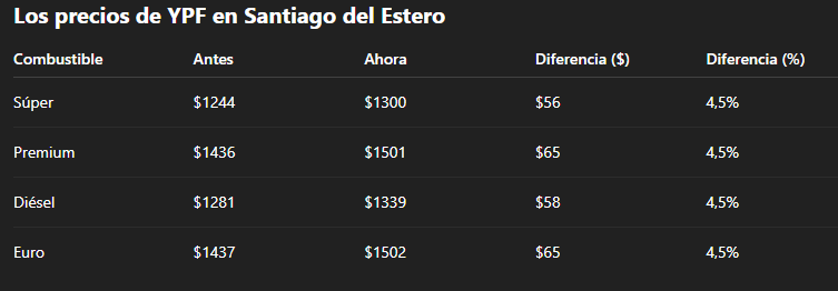 El aumento de los combustibles que aplicó YPF desde hoy en los surtidores locales resultó un punto por encima de lo anunciado por la petrolera en todo el país, ya que el incremento en Santiago del Estero fue de 4,5%.