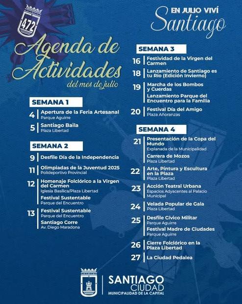 Otras actividades destacadas son el festival sustentable del Parque del Encuentro el sábado 12 y domingo 13, el lanzamiento de Santiago es tu Río edición invierno el viernes 18 y la carrera de mozos en la Plaza Libertad el lunes 21.