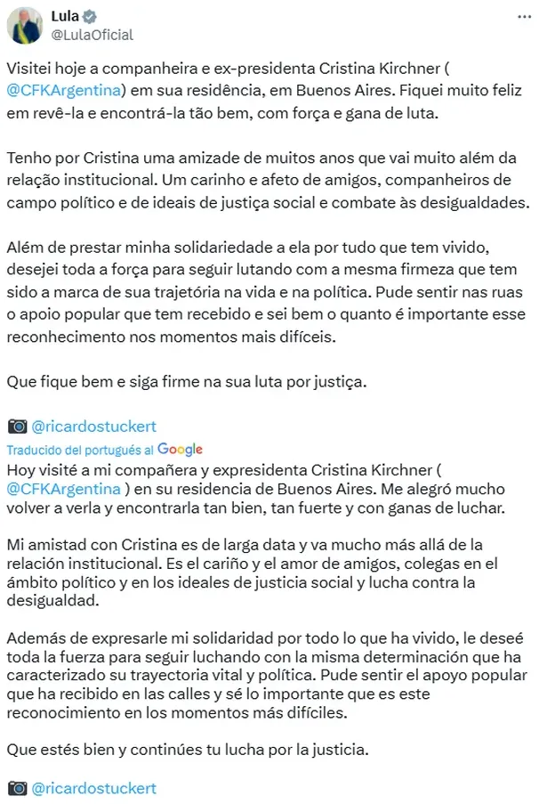 "Hoy visité a mi compañera y expresidenta Cristina Kirchner (@CFKArgentina) en su residencia de Buenos Aires. Me alegró mucho volver a verla y encontrarla tan bien, tan fuerte y con ganas de luchar", comenzó indicando el mandatario brasileño.
