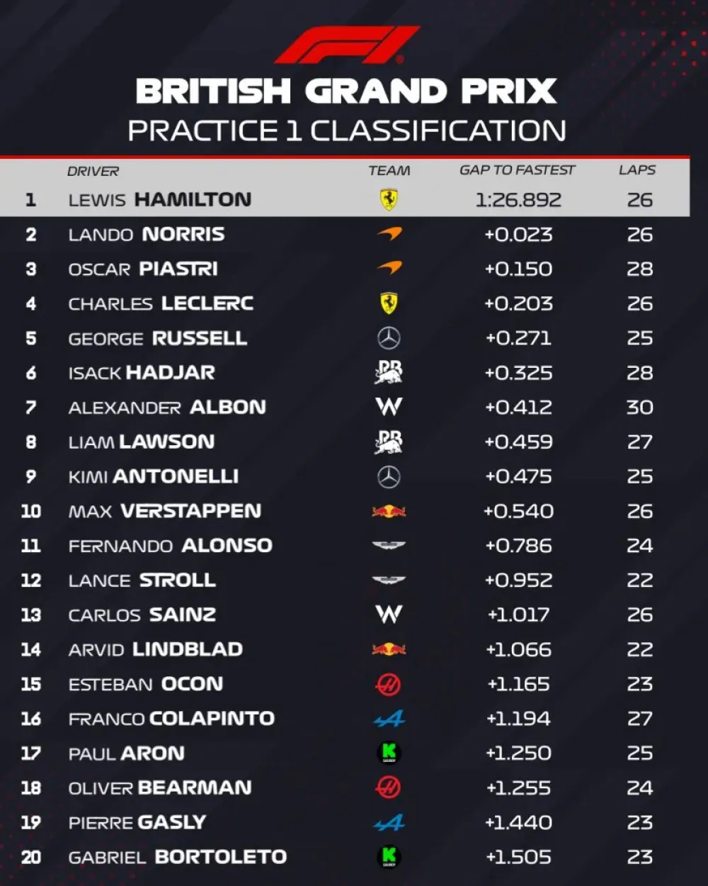 Hamilton, en su circuito predilecto, se hizo fuerte y ganó su primera práctica libre de la temporada. Registró un tiempo de 1:26.892, a 23 milésimas de Lando Norris. Completó el podio el líder del campeonato, Oscar Piastri, que quedó a una décima y media del siete veces campeón del mundo con Mercedes. El que tuvo una floja sesión fue Max Verstappen, que culminó décimo a más de medio segundo de uno de los grandes rivales de su carrera.