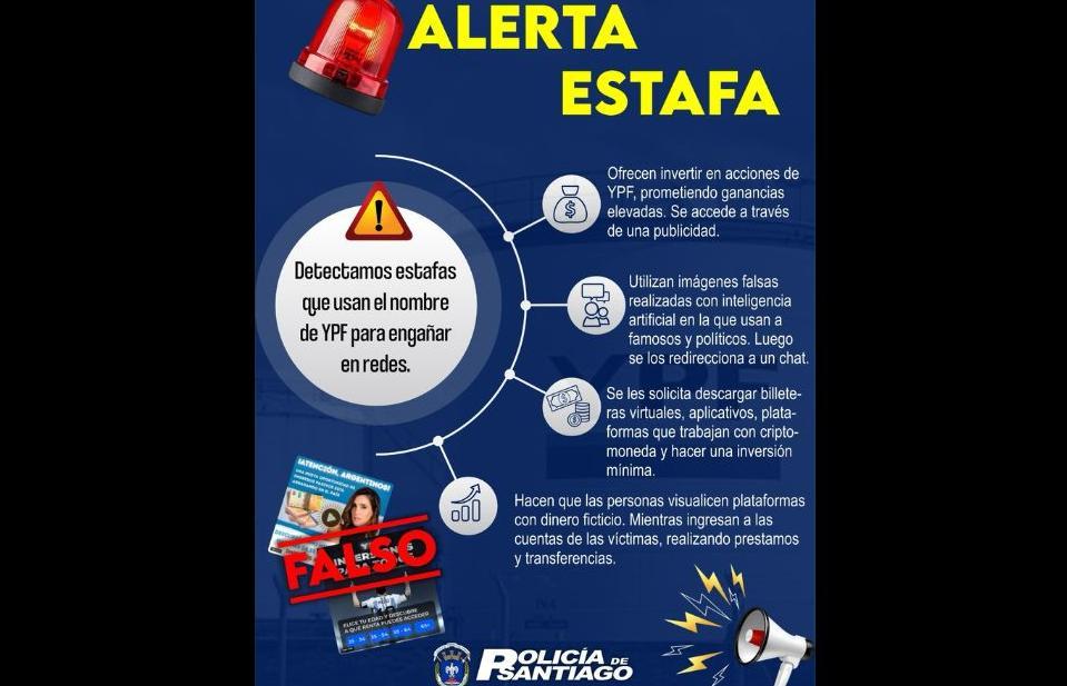 El Departamento de Delitos Económicos de la Policía de Santiago del Estero emitió una advertencia ante una serie de estafas digitales que utilizan el nombre de YPF y la imagen de figuras públicas generadas con inteligencia artificial para captar víctimas a través de redes sociales.