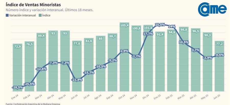En junio, las ventas minoristas de las pequeñas y medianas empresas evidenciaron una caída interanual del 0,5% a precios constantes. Al comparar con el mes anterior, también se verificó un descenso del 6,7%.