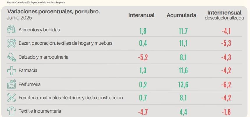 Por su parte, algunos rubros experimentaron incrementos puntuales impulsados por las compras por el Día del Padre y el cobro del medio aguinaldo, aunque estos repuntes no lograron modificar de forma significativa la tendencia general del mercado, que continúa mostrando signos de fragilidad.