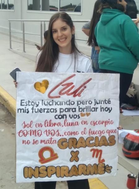 Y lo hizo con un cartel en el que se puede leer: "Lali estoy luchando, pero junté mis fuerzas para brillar hoy con vos. Sol en Libra, Luna en Escorpio como vos como el fuego que no se mata. Gracias por inspirarme".