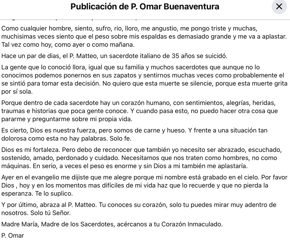 Sacerdotes como el padre Luis Zazano y el padre Omar Buenaventura compartieron sentidos mensajes en redes, destacando que esta muerte no debe silenciarse. "Los sacerdotes no somos máquinas, somos seres humanos frágiles", escribió Zazano, quien también reveló haber atravesado años de depresión. Buenaventura, en tanto, expresó: "Esta muerte grita por sí sola", recordando que los curas también cargan dolores, heridas y soledades profundas.