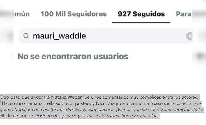 Otro dato que encontró Natalie Weber fue unos comentarios muy cómplices entre los actores: "Hace cinco semanas, ella subió un posteo, y Nico Vázquez le comenta 'Hace muchos años que quiero trabajar con vos. Se nos dio. Estás espectacular. ¡Vamos que se viene y será inolvidable!' y ella le responde 'Todo lo que pienso y siento ya lo sabés. Sos espectacular".