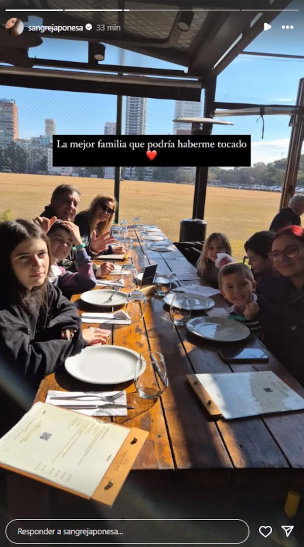 En sus historias de Instagram, compartió una foto familiar con su madre, Marcela Riveiro, y sus hijos, quienes pasaron el feriado rodeados de afecto. "La mejor familia que podría haberme tocado", escribió junto a un emoji de corazón, en lo que muchos interpretaron como un nuevo palito a Vicuña.