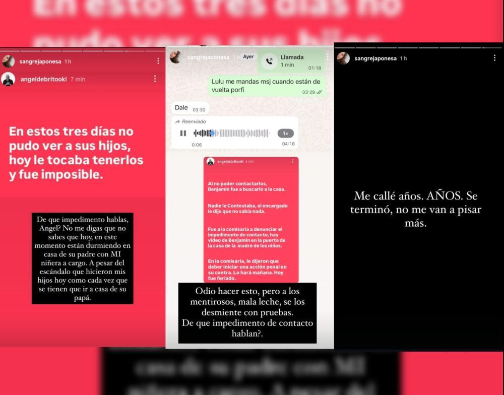 Y continuó, visiblemente molesta: "De qué impedimentos hablás, Ángel. No me digas que no sabés que hoy, en este momento, están durmiendo en casa de su padre con mi niñera a cargo. A pesar del escándalo que hicieron con mis hijos, hoy como cada vez que se tienen que ir a casa de su papá".