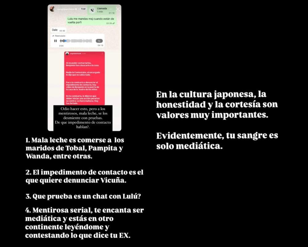 Al ver las publicaciones del conductor, la China Suárez no tardó en responder. Sobre una captura de pantalla con la información difundida por De Brito y un chat con un audio de Vicuña donde informaba que los chicos se quedarían con él, la actriz escribió: "Odio hacer esto, pero a los mentirosos, mala leche, se los desmiente con pruebas. De qué impedimento de contacto hablan".