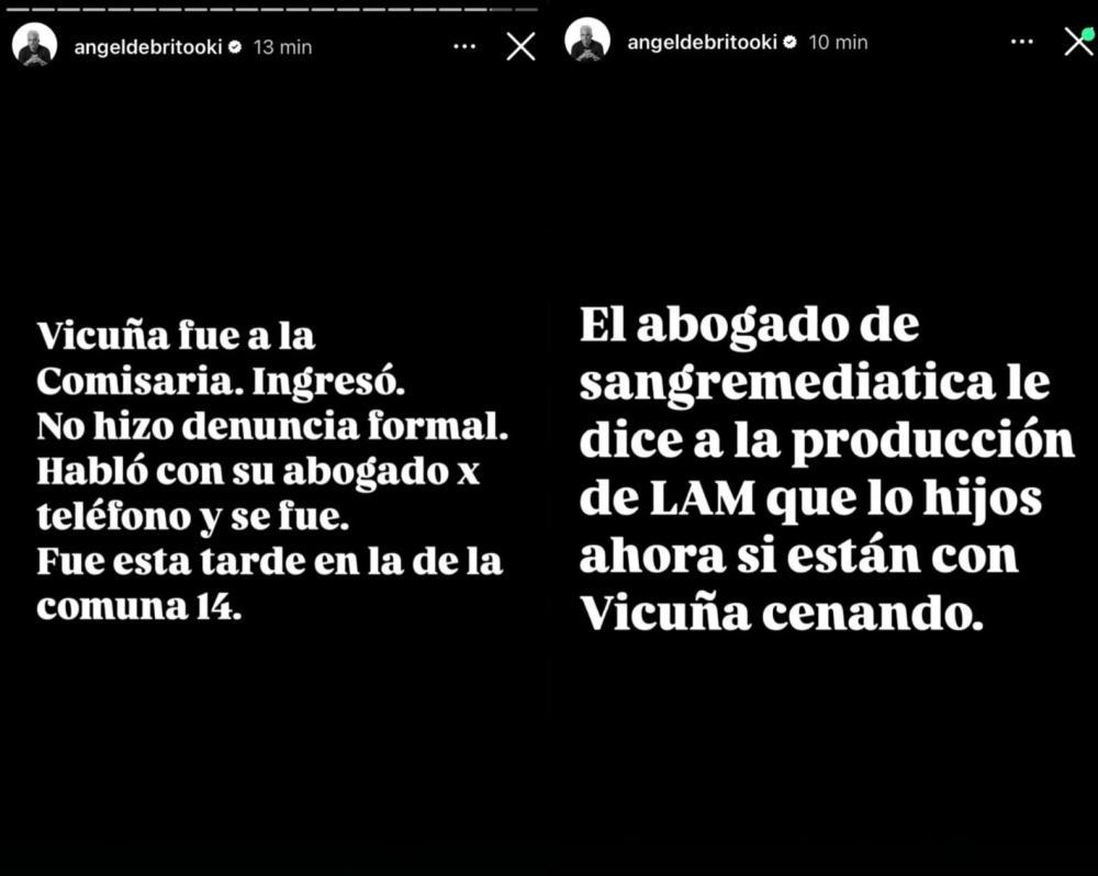 Por último, De Brito contó: "Vicuña fue a la comisaría. Ingresó. No hizo denuncia formal. Habló con su abogado por teléfono y se fue. Fue esta tarde en la de la comuna 14". "El abogado de sangremediática le dice a la producción de LAM que los hijos ahora sí están con Vicuña cenando", cerró.