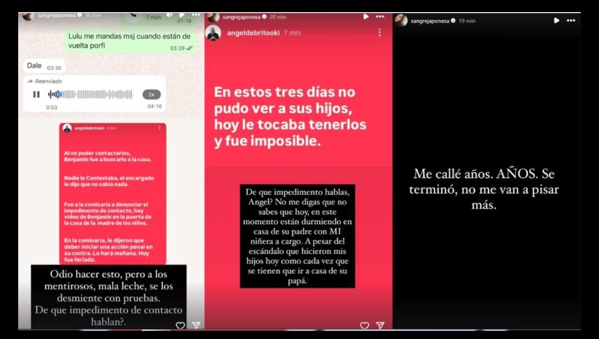 En la siguiente historia, la "China" compartió un mensaje en el cual el comunicador expresaba: "En estos tres días no pudo ver a sus hijos, hoy le tocaba tenerlos y fue imposible". "¿De qué impedimento hablás, Ángel? No me digas que no sabés que hoy, en este momento, están durmiendo en casa de su padre, con mi niñera a cargo. A pesar del escándalo que hicieron mis hijos hoy, como cada vez que se tienen que ir a casa de su papá", lanzó.