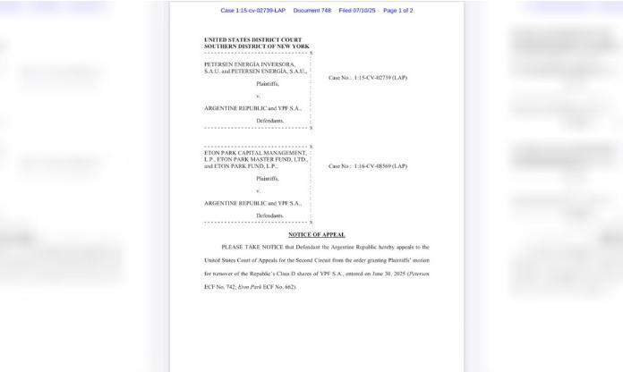 El Gobierno argentino apeló el fallo de la jueza Loretta Prezka que ordenó la entrega de las acciones de YPF para pagar la sentencia de US$ 16.000 millones por la nacionalización de la empresa.