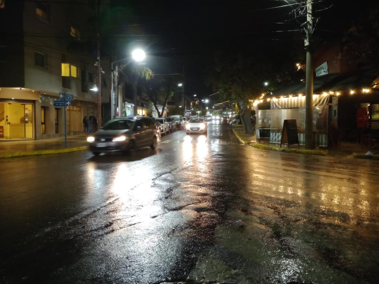 Si bien en horas del mediodía había comenzado a prevalecer una leve brisa fresca y a cubrirse el cielo, la tenue lluvia llegó varias horas después, cambiando totalmente el panorama en la ciudad que, pese al frío y al agua, aún muestra movimiento en sus calles aunque de forma reducida.