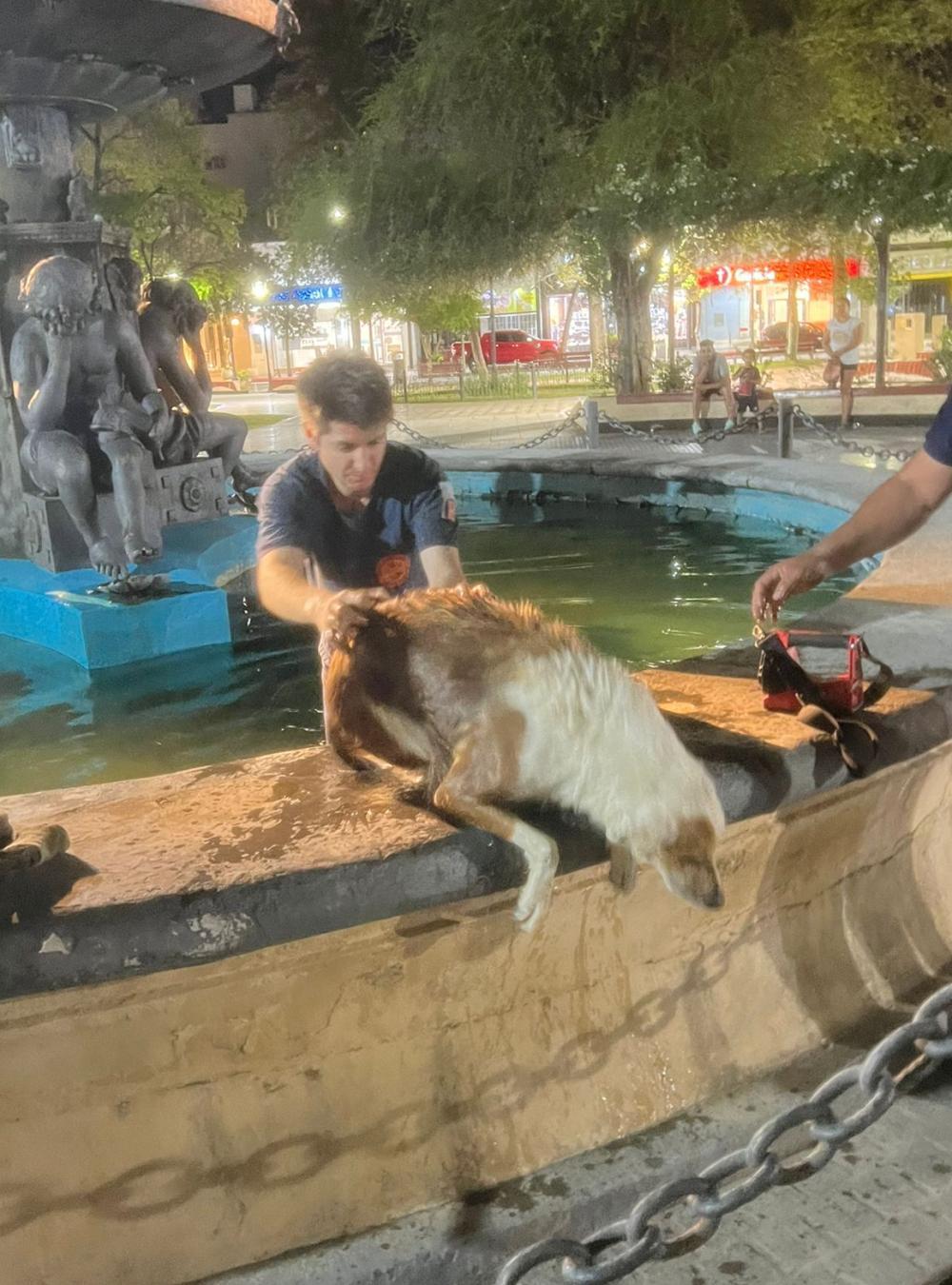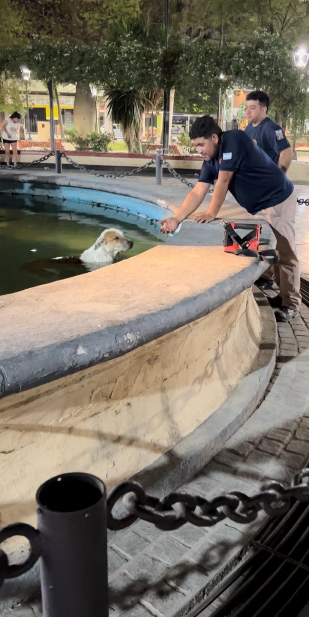 Bomberos voluntarios de Santiago del Estero Capital tuvieron anoche la particular tarea de rescatar a un perro atrapado en el interior de la fuente de la Plaza Libertad.